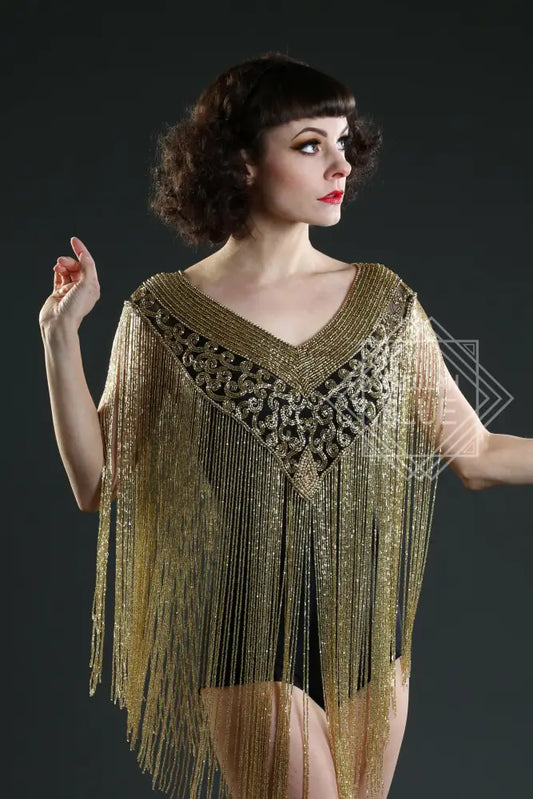 1920 Gold Embellished Beaded Great Gatsby Cape Fringe Top